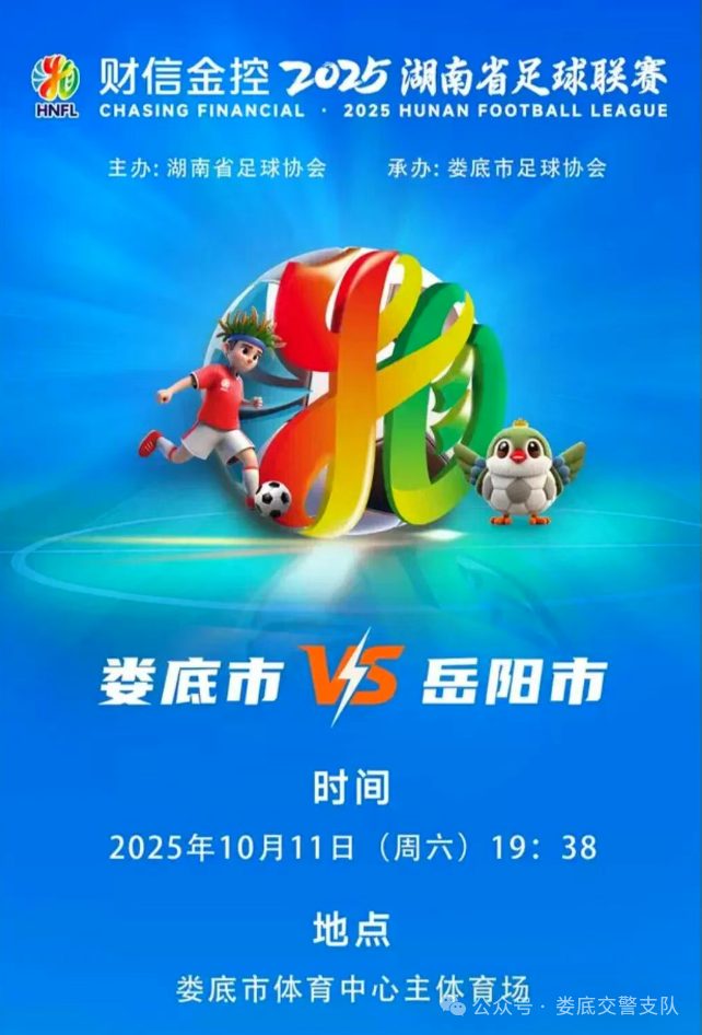 10月11日,“湘超”联赛战火重燃,娄底队将在市体育中心主场迎战岳阳队。为确保赛事安全顺利进行,保障赛事期间场馆周边道路交通安全、畅通、有序,请您花一分钟时间阅读这份临时交通指南提前规划好出行路线!