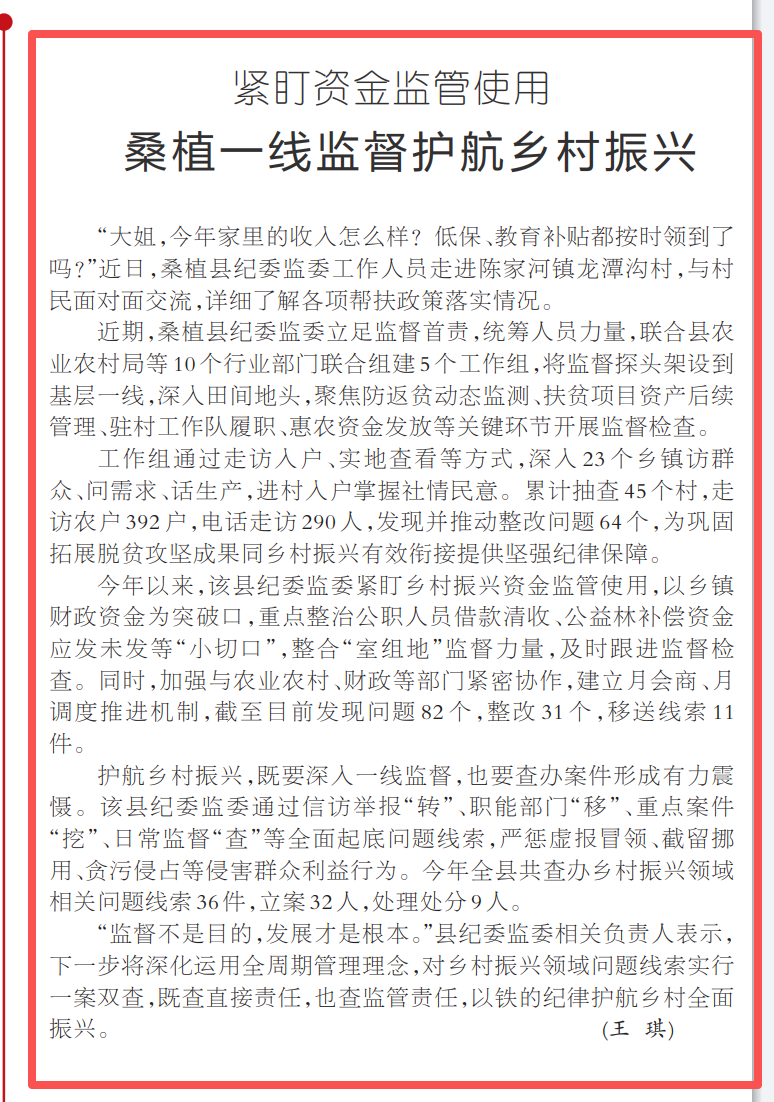 护航乡村振兴,既要深入一线监督,也要查办案件形成有力震慑。该县纪委监委通过信访举报“转”、职能部门“移”、重点案件“挖”、日常监督“查”等全面起底问题线索,严惩虚报冒领、截留挪用、贪污侵占等侵害群众利益行为。今年全县共查办乡村振兴领域相关问题线索36件,立案32人,处理处分9人。