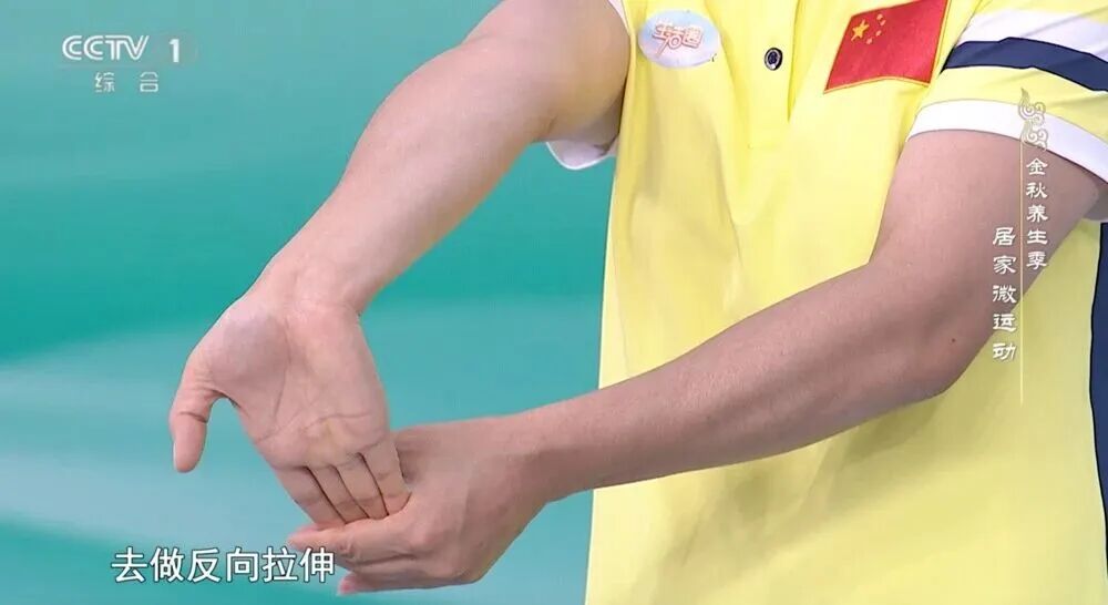切菜拉伸:伸出手掌,用手指远端扣紧末节做反向拉伸(手臂拉长、不耸肩),或手心朝天、手腕伸展扳大拇指(放松前臂旋前肌群)。
