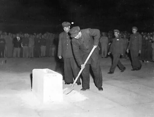 1949年9月30日傍晚,人民英雄纪念碑奠基典礼上,毛泽东、朱德、贺龙、粟裕、刘伯承先后挥锹奠基。