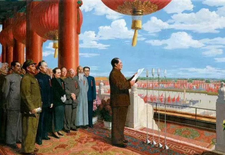 1949年10月1日下午,天安门广场红旗猎猎卷来半天云霞。3时整,中央人民政府秘书长林伯渠宣布中华人民共和国中央人民政府成立典礼开始。在《东方红》乐曲声中,中央人民政府主席、副主席和委员就位。毛泽东身着黄呢中山装,神采奕奕站在天安门城楼正中央,用浓重的湖南口音向全世界庄严宣告:“中华人民共和国中央人民政府今天成立了。”这是一个伟大民族从此站起来的政治宣言,是一声长久定格在历史天空的时代惊雷。当时的天安门广场,30万军民欢声雷动,犹如山呼海啸。