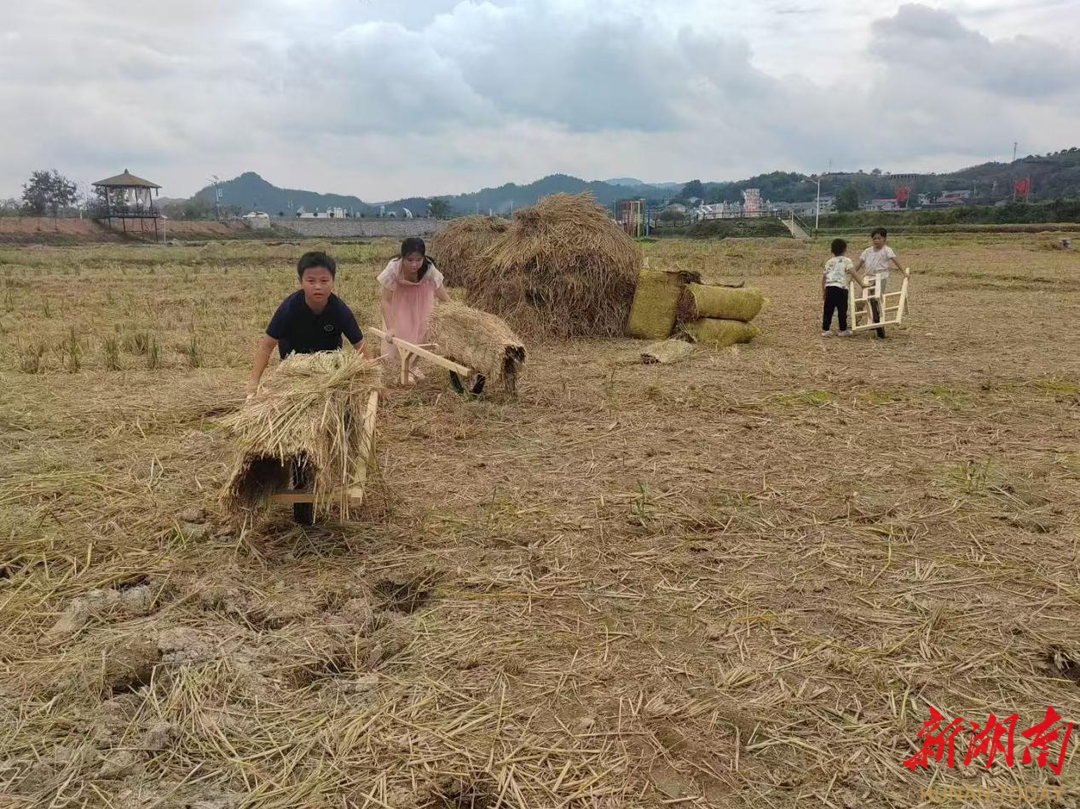 “加油!稳住车把!”稻田里的赛道上,孩子们推着独轮车奋力运送粮草,家长在一旁紧张指导。这项“独轮车运粮草”活动,通过还原农耕场景,让孩子亲身感受劳作艰辛与协作乐趣。