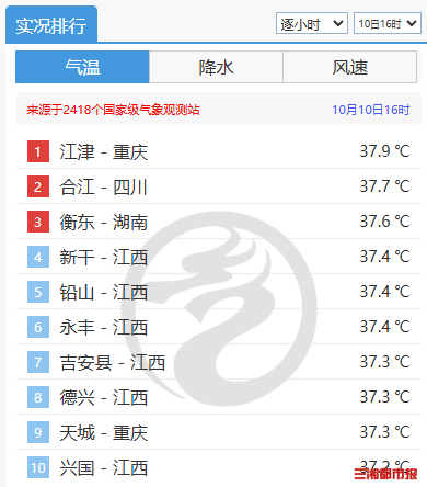 截至10月10日16时,全国高温排行榜前十被湖南、江西、重庆站点包揽,其中,湖南衡东站以37.6℃位列全国第三。城市中,武汉、南昌、重庆、长沙都出现高温,均刷新了各自的最晚高温日纪录。