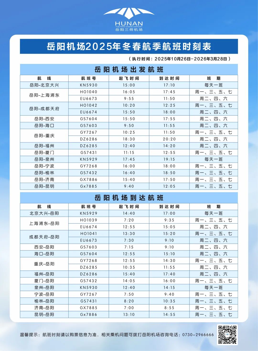 岳阳市民注意,好消息来啦!记者从岳阳三荷机场获悉,为满足岳阳经济发展需求,方便市民出行,岳阳三荷机场在2025年冬春航季(从2025年10月26日开始),将通达北京、上海、成都、西安、海口、重庆、福州、厦门、泉州、宁波、榆林、济南、昆明等13个城市,其中北京、上海、成都、重庆航班,每天都有一班。