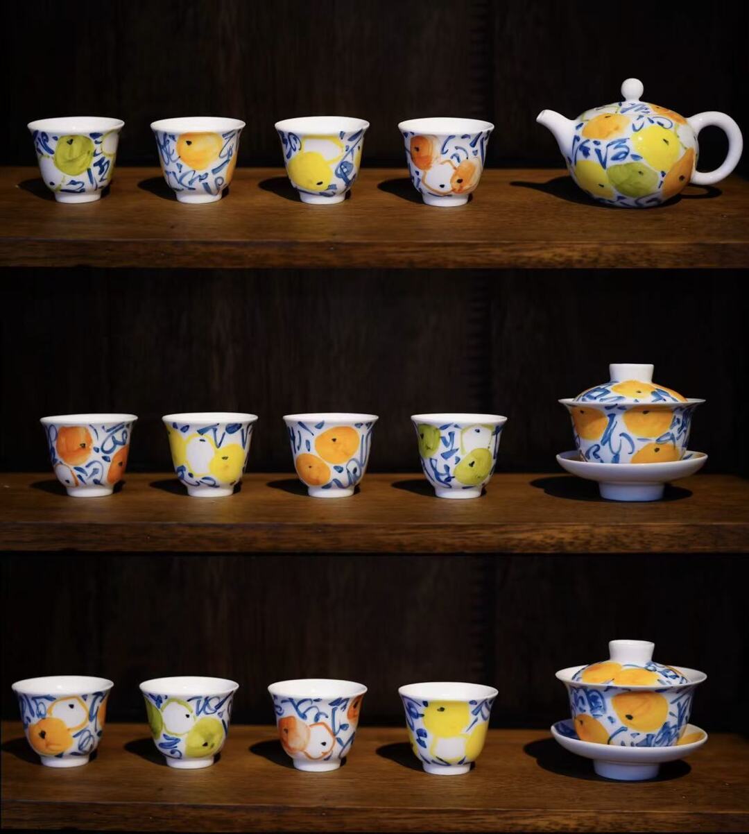 洞口宋窑工作室前坪,阳光透过枝叶的缝隙,洒在一排排刚出窑的瓷器上,使其泛出通透而温润的质感。王周能戴着粗布手套,小心翼翼地拿起一只茶壶新品,这是专为洞口蜜橘而设计的茶具,1个壶(盖碗)加4个杯子的组合,周身配色橙黄绿交织,鲜活明快,再融入书法艺术,使其独具韵味,完美融合了书法韵味与蜜橘形态,让这套茶器既具艺术感,又满含乡土气息。