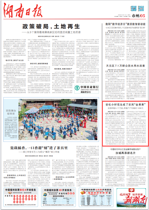 安化小籽花生是国家地理标志产品,获得地理标志保护,具有“红颜、嫩肉、甜心”的特点,蛋白含量高、油脂低,享有“珍珠花生”美誉。作为安化小籽花生核心产区,乐安镇邀请湖南农业大学、省农科院的教授专家长期驻点开展“校社合作”“院场合作”等,探索形成“安化小籽花生”良种、良法、良药、良制、良机“五良”配套技术体系,从156个农家品种中培育出3个高产优质品种,亩产由90公斤突破至250公斤。目前,全县种植安化小籽花生5.17万亩,市场均价50元/公斤,产业发展覆盖近5万人,户均增收1200元。