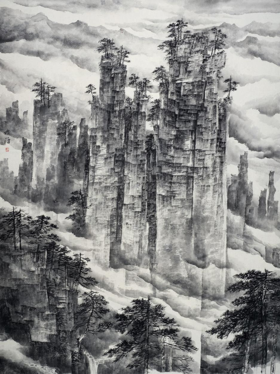 中国山水画追求的最高境界之一就是表现“生命力”,但不是照相般描绘动植物生机勃勃那么简单,而是通过艺术家对贯穿于宇宙、自然与艺术之间的哲学性生命力的观察体验,来表现天地万物的生命流动生生不息之气。“漫步山水间”,就是去寻找与感悟山川流水风物中的这种“气”,将大自然的内在规律,与人类社会的生命律动交流融通,而产生的勃勃生机。所以,代山川立言,为万物写生,因此,如何将山的雄奇,水的柔韧,树的虬劲,云的飘逸,天的深远,赋予人的血性、智慧、意志、信念,以有限的时空笔力,画出无穷的生命活力,则需要艺术家们不断上下求索、接续努力攀登。