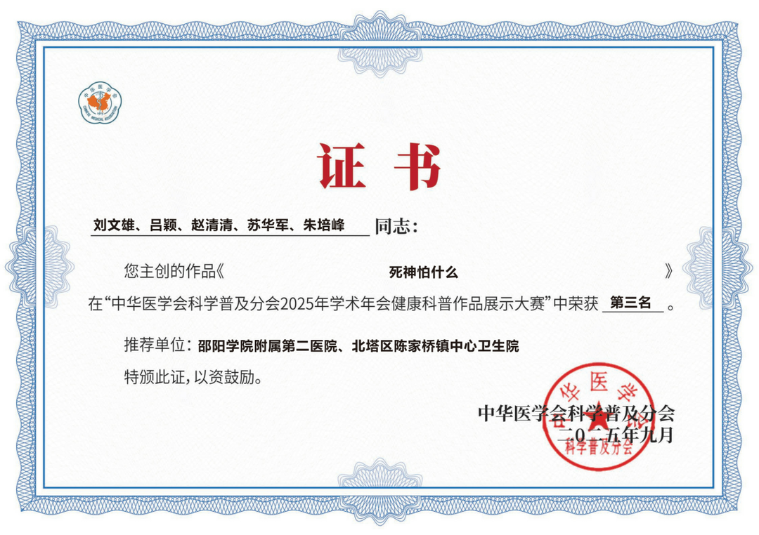 湖南日报·新湖南客户端10月11日讯(通讯员 赵清清 吴艳红)近日,在江西南昌举办的中华医学会科学普及分会2025年学术年会上,由北塔区陈家桥镇中心卫生院与城市医疗集团总院(邵阳学院附属第二医院)合作创作的科普视频作品《死神怕什么》,从全国1300余件参赛作品中脱颖而出,荣获健康科普作品展示大赛第三名,充分展现了我区城市医疗集团在健康科普创作与推广方面的扎实功底与创新活力。