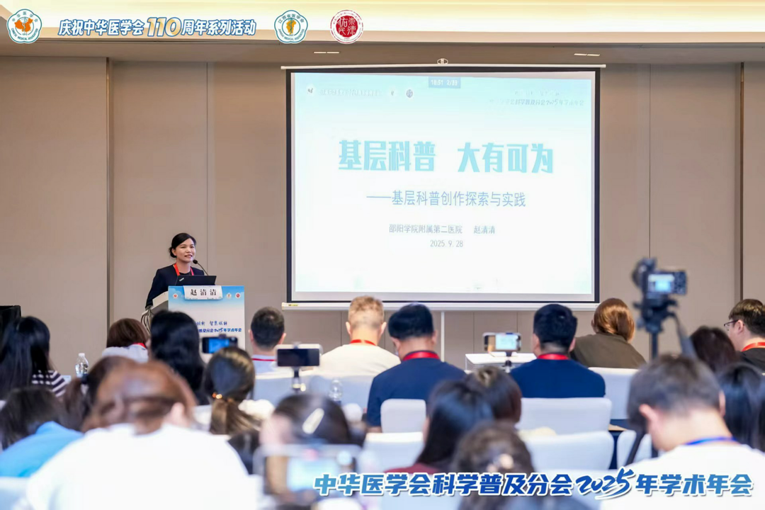 值得一提的是,北塔区城市医疗集团总院(邵阳学院附属第二医院)基层医疗服务部主任、区卫健系统科普专家赵清清同志,也应邀在年会作了题为 《基层科普 大有可为——基层科普创作探索与实践》 的专题报告,系统介绍了我区城市医疗集团在整合资源、搭建平台、培育队伍、开展科普活动等方面的创新做法与典型案例,受到与会专家的高度评价。