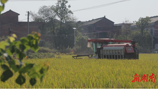 湖南日报·新湖南客户端10月11日讯(通讯员 邹健 李洁霞 廖辉煌)“一天可收割30亩左右,预计在10月20日前全部收完晚稻。”今天,在衡阳县三湖镇杨林村优质稻示范片,一片片金黄色的稻田散发着稻谷清香。95后种植大户张灿驾驶着收割机在田间来回穿梭进行收割,将稻谷转运到烘干中心烘干。