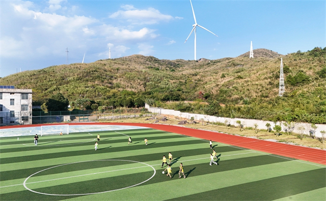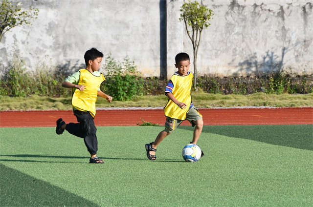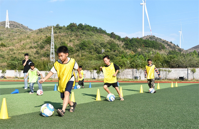 On October 10, pupils practice football skills on the football field at Huangjialing School, Songbai Yao Township, Jiangyong County. In recent years, the county authority has significantly increased the frequency and intensity of sports activities on campus. It has been striving to stimulate students' enthusiasm for physical exercise via enriching the physical education curriculum and establishing sports clubs and interest groups. (Photo/Tian Rurui)