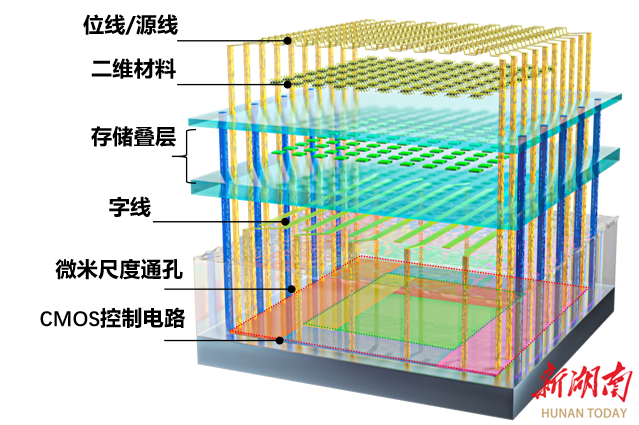二维-硅基混合架构闪存芯片结构示意图,包含二维模块、CMOS控制电路和微米尺度通孔