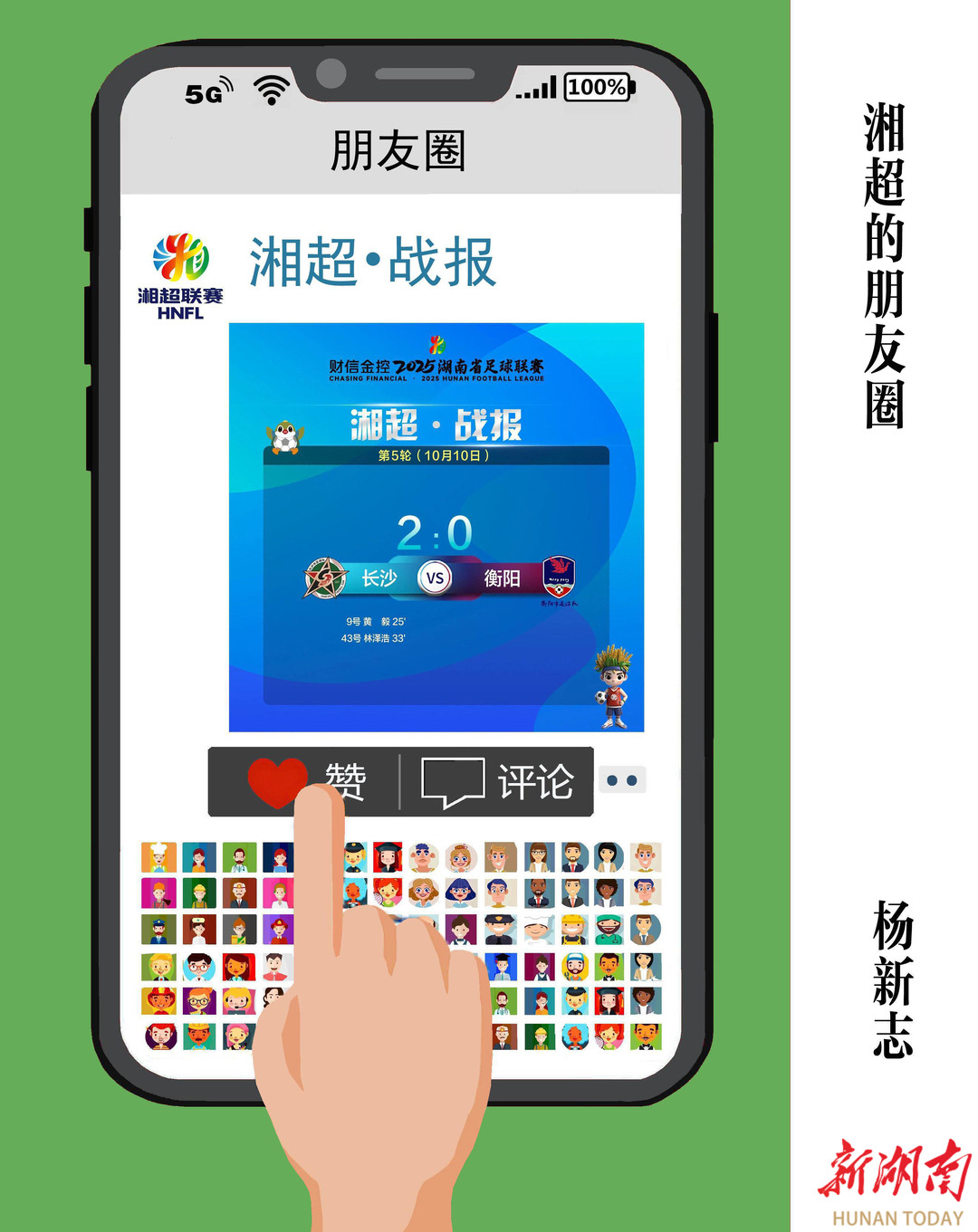 10月10日,湘超第5轮长沙主场以2-0战胜衡阳队。漫画:湘超的朋友圈 作者:杨新志