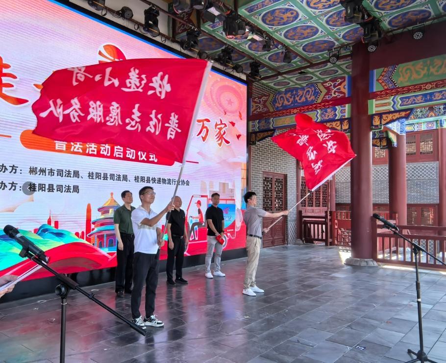 10 月 10 日,由郴州市司法局、桂阳县司法局主办,桂阳县快递物流行业协会参与的“快递走千村、普法进万家”普法活动启动仪式在郴州桂阳县文化园古郡城中心大戏台举行。200余名快递行业、社区群众代表共同见证“法治+快递”跨界普法新模式的落地,为桂阳县普法工作注入全新活力。