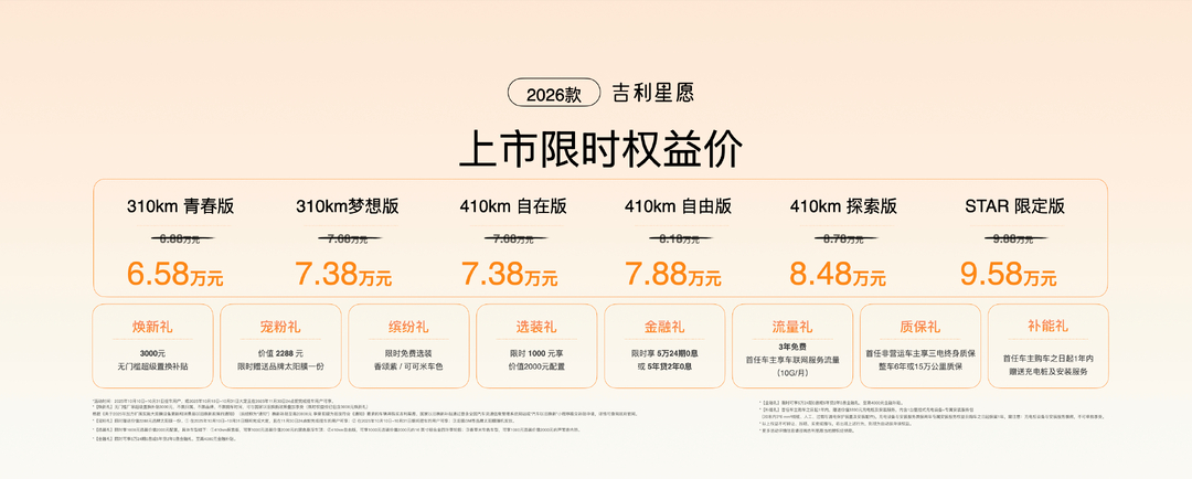 10月10日,2025吉利汽车用户大会暨2026款吉利星愿上市发布会在杭州举行。新车共推出6个版型,“起步即高配”,全面覆盖用户需求,限时权益价为6.58万元–9.58万元。
