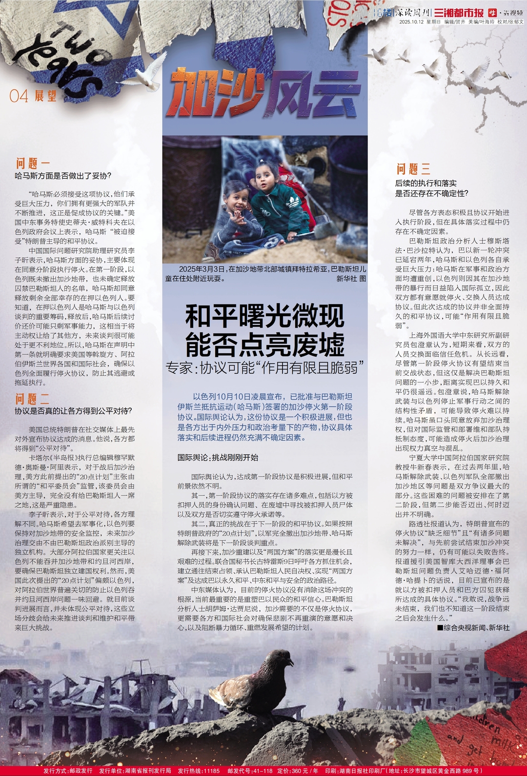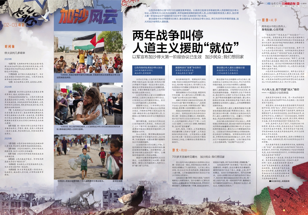 2025年10月10日,以色列政府批准加沙停火协议,以军将在24小时内撤军并停火,此后72小时内被扣押人员将获释。和平的曙光初现,加沙人对和平家园的渴盼又近了一步。