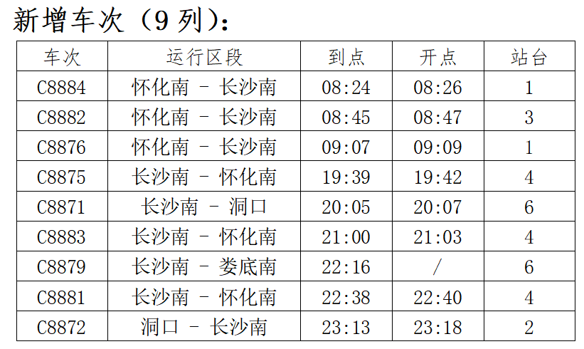 本次调图最大的变化点为新增了9列城际列车,C8884次(娄底南站8:24到/8:26开)、C8882次(娄底南站8:45到/8:47开)、C8876(娄底南站9:07到/9:09开)、C8875次(娄底南站19:39到/19:42开)、C8871次(娄底南站20:05开/20:07到)、C8883次(娄底南站21:00到/21:03开)、C8879次(娄底南站22:16到)、C8881次(娄底南站22:38到/22:40开)、C8872次(娄底南站23:13到/23:18开),更加便捷了旅客的出行。