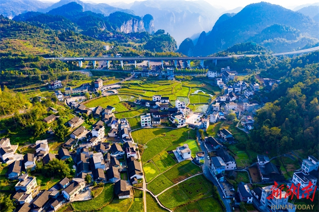 In Paixiong Village, Aizhai Town, Jishou City, the local dwellings, fields, and remote mountains add beauty to each other, creating a picturesque scenery. (Photo/Liu Zhenjun)
