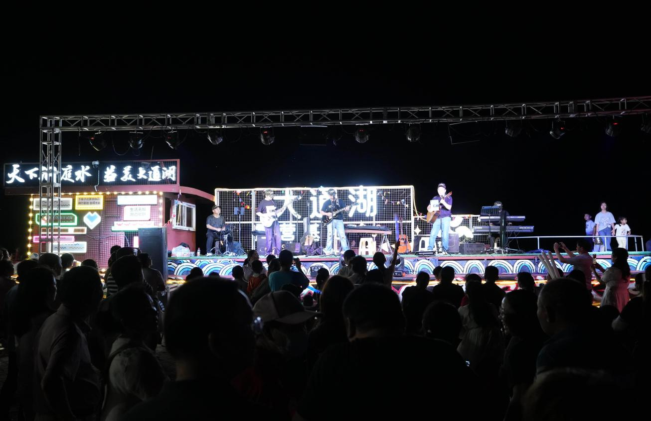 10月1日—8日,大通湖畔露营基地人流涌动,欢声笑语不绝于耳,每晚的音乐盛宴准时上演。夕阳的余晖映衬着波光粼粼的湖面,舞台的灯光随着夜幕渐次亮起,本地乐队率先开唱,随后登场的特邀歌手将现场气氛推向一个又一个高潮。《我和我的祖国》旋律响起,游客们随之摇摆,手中的荧光棒划破夜空,汇成一片音乐的星海点燃了每一个大通湖的夜晚,也温暖了每一位游客的心田。