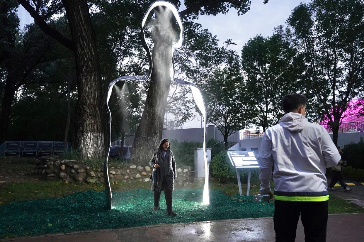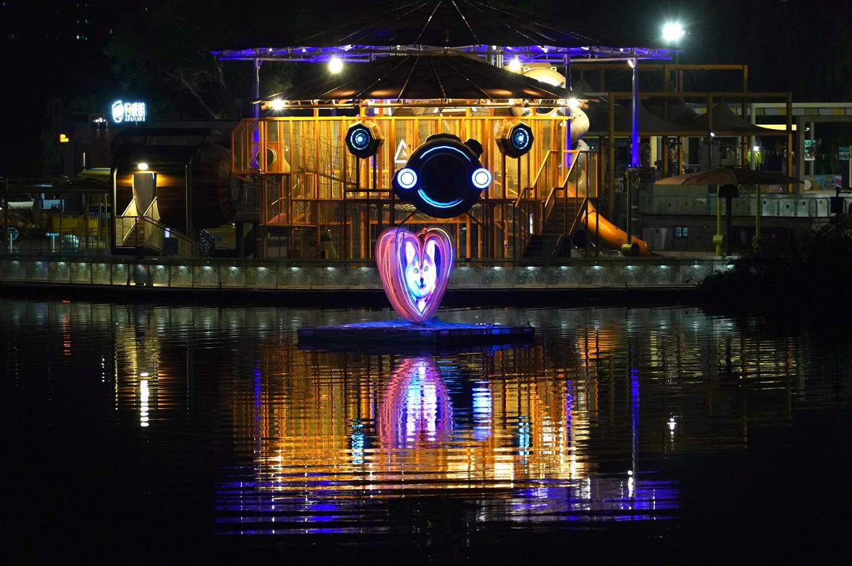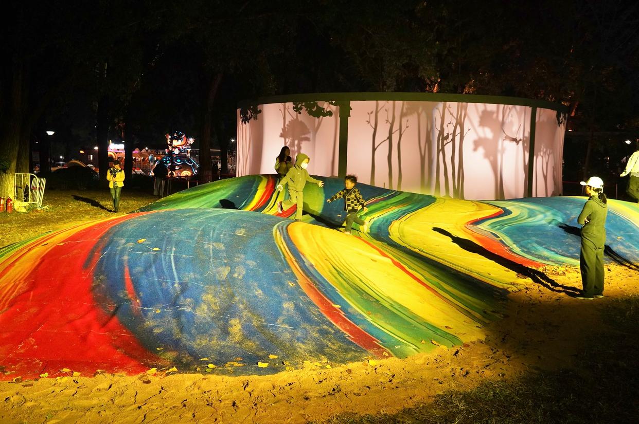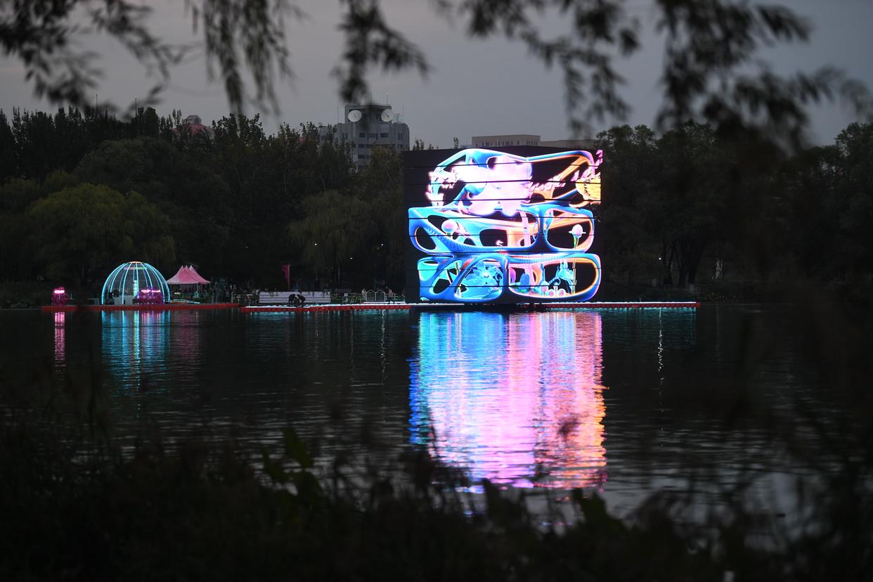 再往前走,朝阳公园更是热闹。幻光之山、彩虹蹦蹦云、拾光花园等光影艺术装置星罗棋布。贝壳剧场如同浮光岛屿,舞台与河水连成同一幅柔光画布,湖面升起十米光影鲲鹏,LED百骏踏水奔腾……这是北京首个跨水域空中光影表演——“飞跃蓝湖”呈现的场景。