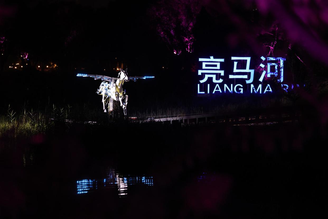 漫步亮马河边,散落的水晶花、会发光的云朵座椅以及银杏造型的灯光装置,将水岸装点得流光溢彩。好运桥下,光线投射在步道和墙面上,如潺潺水波。琉璃桥畔,一匹“飞马”双翼舒展踏水而来,烟雾环绕。