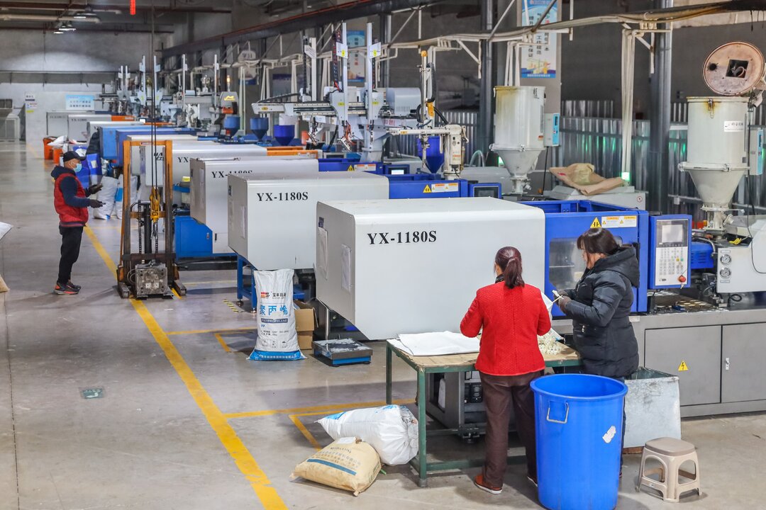 蓝山县工业园湖南航登科技有限公司自动化注塑生产线上,工人在生产箱包配件。彭华摄