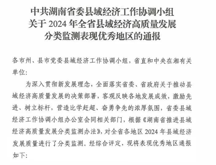 湖南日报·新湖南客户端10月13日讯(通讯员 刘神尊)近日,湖南省县域经济高质量发展考核结果公布,岳阳市华容县再度获评“全省县域经济先进县”,连续两年获得此项殊荣。回溯三年发展轨迹,从2022年芥菜产业成为全省十大典型案例,到连续两年跻身县域经济先进梯队,华容县以实干为笔,在高质量发展画卷上写下了浓墨重彩的篇章。