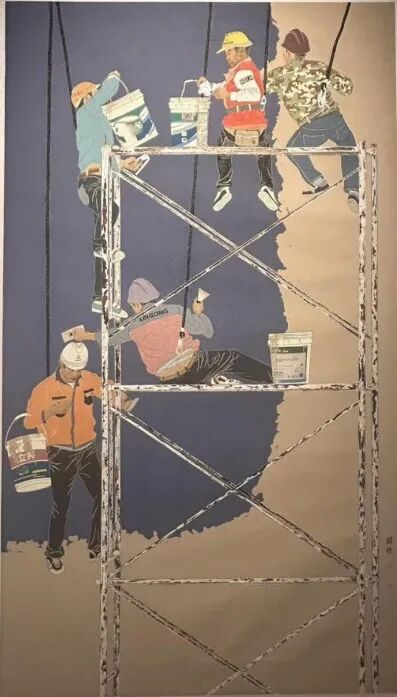 《红旗渠》反映的是当年林州人民在太行山区凿山取水的真实场面。画面中人物衣着朴素,但却面带笑容,从乐观并且坚毅的表情中看出,他们秉持着“自力更生、艰苦创业、团结协作、无私奉献”的红旗渠精神,仿佛幸福美好的生活就在眼前。作者对于宏大场面的把控十分到位,对于众多人物组合和分割显得游刃有余,形成了一种强烈的节奏感、地域感和劳动韵律感。《绝壁有路》反映太行山区人民为了走出大山,不畏困难,依山就势、顺崖凿洞的历史。《刷新世界》描绘了农民工为城市的美丽建设努力奋斗。这些作品都反映出人民群众在中国共产党的领导下,奋发图强,排除万难,为祖国建设添砖加瓦,为美好生活不懈奋斗的美好场面。
