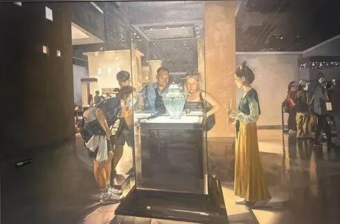 宋若曦 《文化之旅》 油画,观众在展柜前驻足观赏湖南出土商代文物《皿方罍》