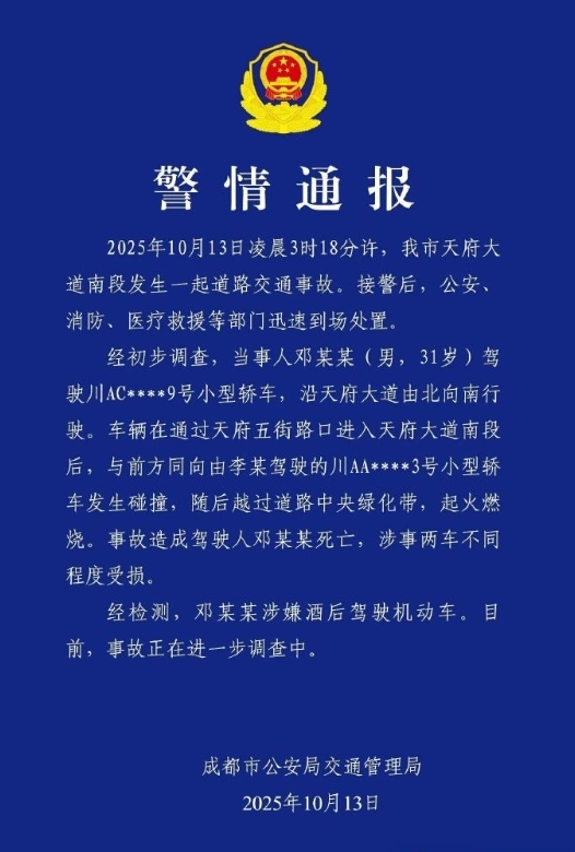 2025年10月13日凌晨3时18分许,我市天府大道南段发生一起道路交通事故。接警后,公安消防、医疗救援等部门迅速到场处置。