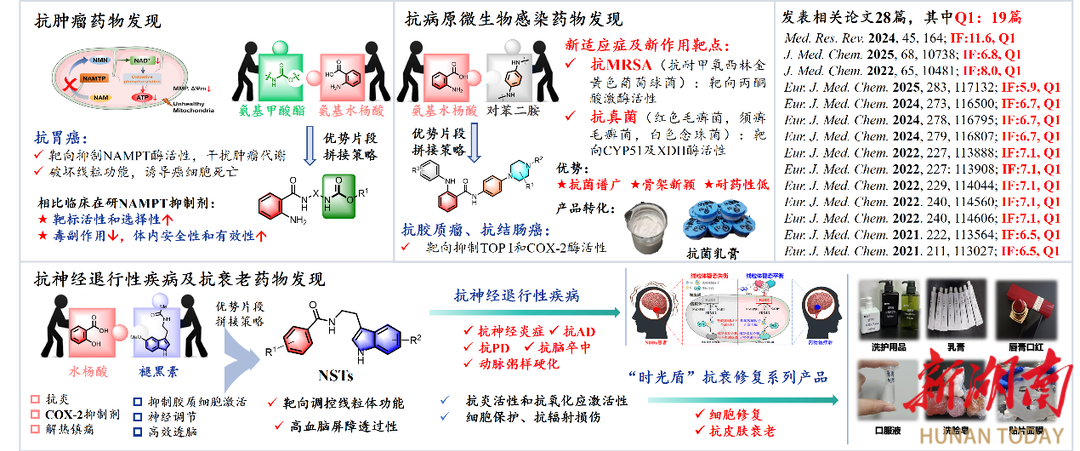 南华大学药物设计与研发团队长期致力于基于片段的药物分子设计,以邻氨基苯甲酰为母核,融合具有良好成药性和明确定义靶点的药效片段,围绕肿瘤、病原微生物感染及神经退行性等重大疾病,发现了多个具备临床开发价值的抗真菌/细菌、抗胃癌、抗线粒体损伤相关性疾病的候选药物。目前,该团队正积极推进科技成果转化,依托自主成立的衡阳泽岐生物医药有限公司,在A轮融资的支持下完成了抗菌乳膏、修复面膜、抗菌日化品等多个品种的初步工艺研究,未来将开展下一轮的项目融资,全力推进产品落地应用。