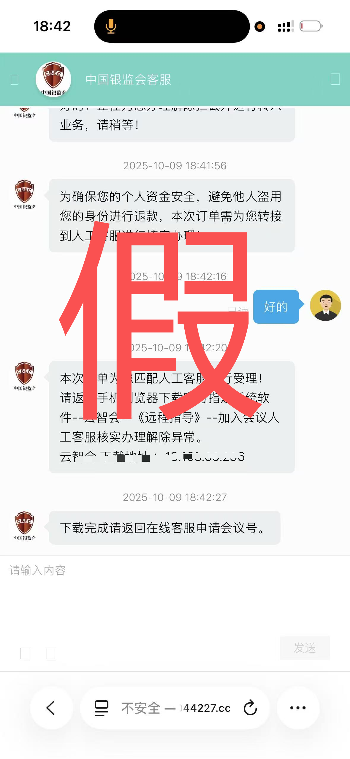 随后,骗子又以“需解除资金拦截”为借口,引导唐先生联系所谓的“在线客服”,并点击进入一个伪装成“国家金融监督管理总局”的钓鱼网站。在该网站中,唐先生被诱导寻找“人工客服”以“解除拦截”,并按要求下载某会议软件。对方声称,需扫码支付后方可进行“视频认证”并办理退款。