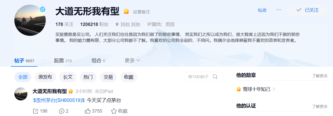 10月13日,知名投资人段永平在其雪球账号“大道无形我有型”的主页上表示:“今天买了点茅台。”
