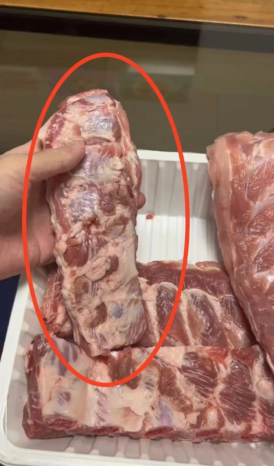 王先生表示,一份猪肋排一共4块,他在分装时发现其中一块的颜色较深,“拿起来闻了一下,一股恶臭。”王先生说,当时就被那股异味恶心到了。