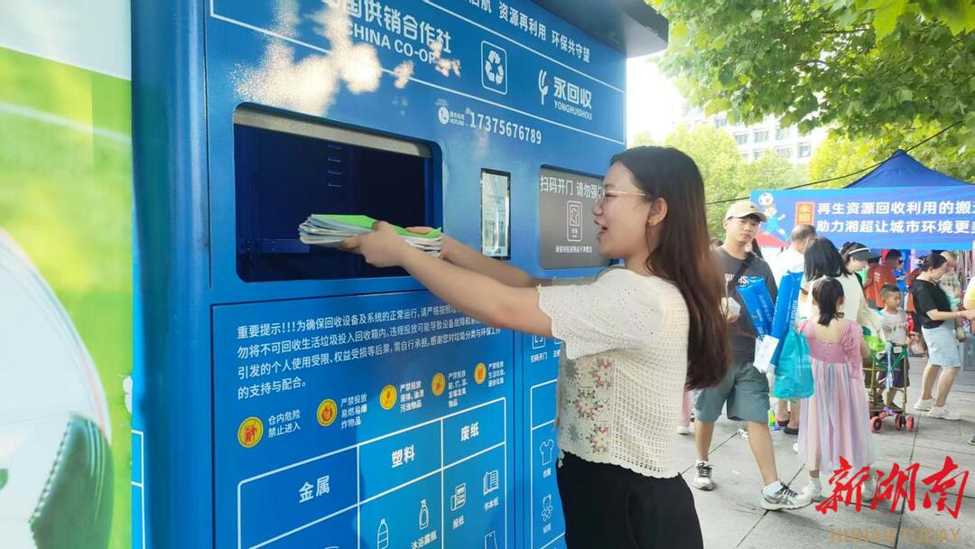在观众进场的主干道旁,几个蓝色的“大块头”格外醒目,不少市民发现,扔入喝完的矿泉水瓶竟然可以立马微信提现。“只需要扫码注册,将可回收物投入到对应入口,机器就会自动称重结算金额,满0.3元就能提现。”现场的工作人员一边演示操作,一边向观众介绍这台“永回收”智能回收箱。该设备可回收金属、塑料、废纸、织物四大类常见可回收物,机身用图文标注每类可回收物的特征示例,从矿泉水瓶到旧衣物,让人一目了然,轻松掌握分类方法。很快,回收箱前便围满了市民,踊跃体验操作。目前已在冷水滩区累计投放160台设备,服务网络覆盖超过70个居民小区。