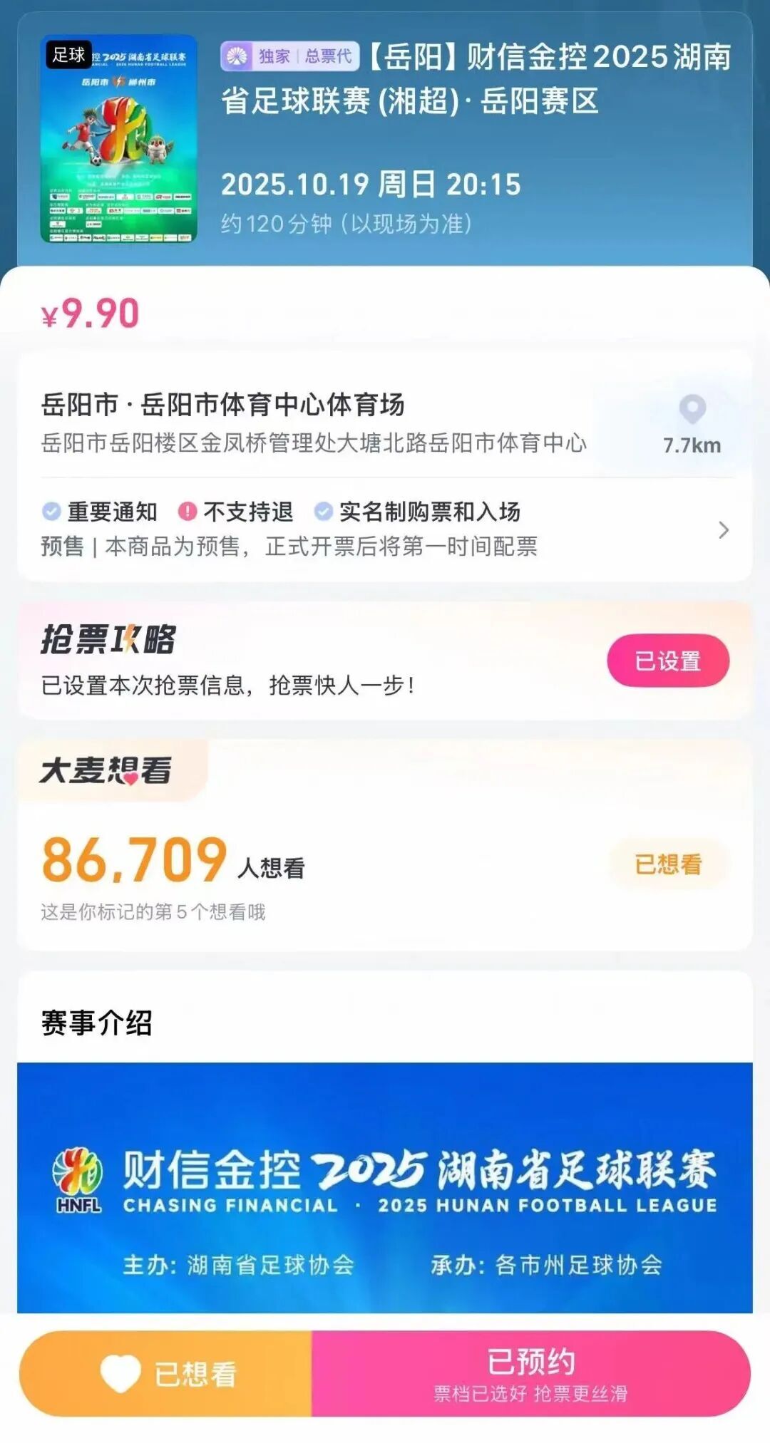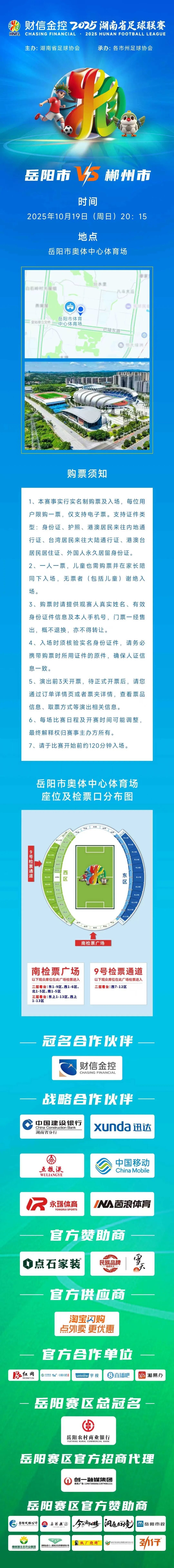 球迷朋友们注意啦!10月19日20:15,“湘超”岳阳队将在主场迎战郴州队,现在已开启门票预约。速速预约抢票快人一步!