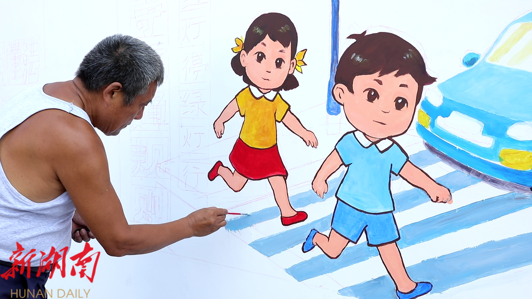 10月10日,在江永县四方井社区的公共墙面上,一位志愿者正专注地勾勒图案,以墙为“画布”,将安全与文明等主题融入画作,让一面面旧墙体变身传播文明,普及知识的“七彩画卷”。