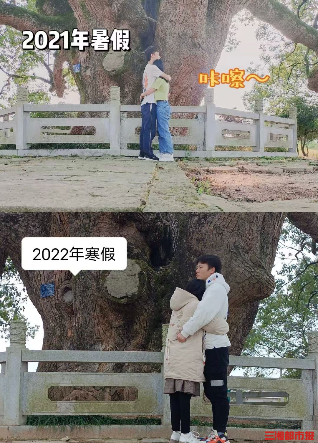 岳阳平江,一棵历经2200年风雨的古樟树,甜蜜见证了一段跨越9年的爱情长跑。从校服到婚纱,“95后”钟喜明和李嘉雯每年都会在树下合影,记录彼此的成长与蜕变,这棵古树也成为他们爱情长跑中最特别的“证婚人”。