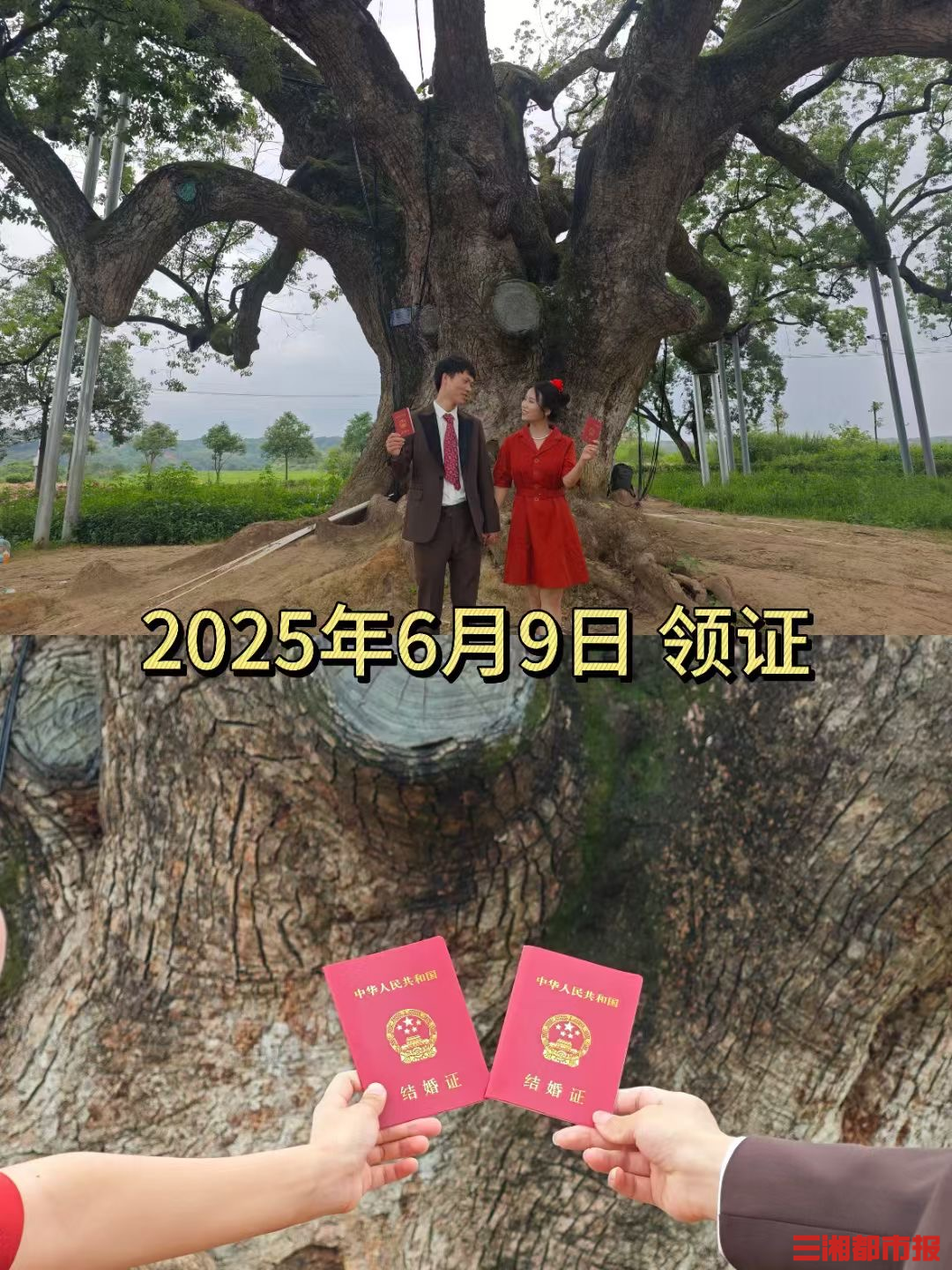 2025年,这对恋人终于步入婚姻的殿堂。6月9日,两人登记结婚;10月1日,他们举办婚礼。婚后第一件事,便是回到古树下拍摄今年的合影。