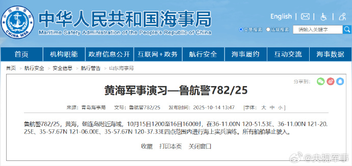 据中国海事局网站消息,青岛海事局发布航行警告,10月15日12时至16日16时,黄海朝连岛附近海域进行海上实兵演练,所有船舶禁止驶入。