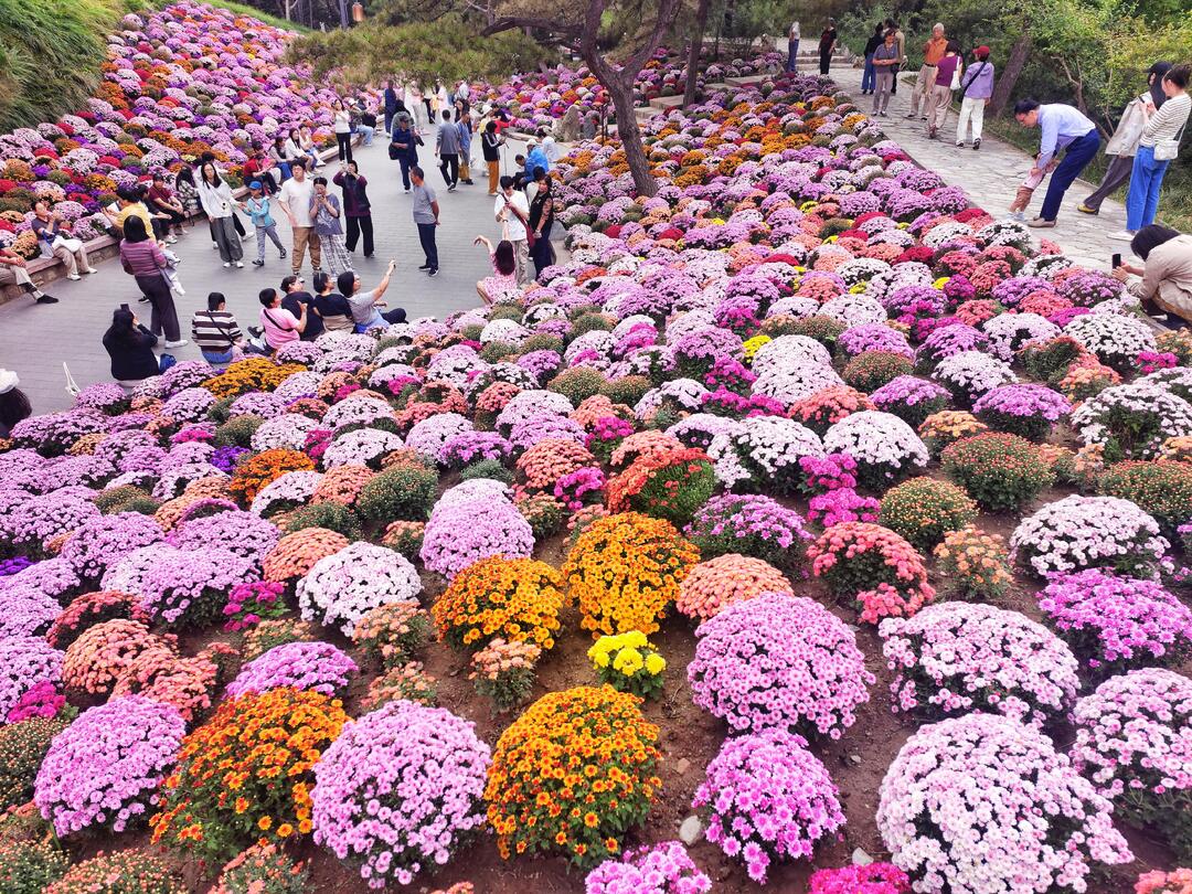 色彩艳丽菊花群与来往的游人辉映成趣。赵承顺 摄