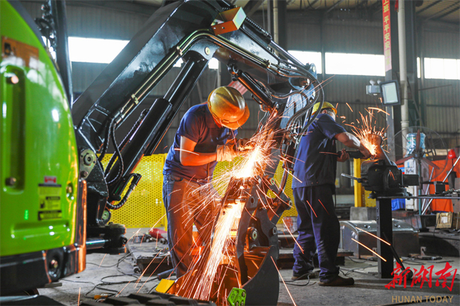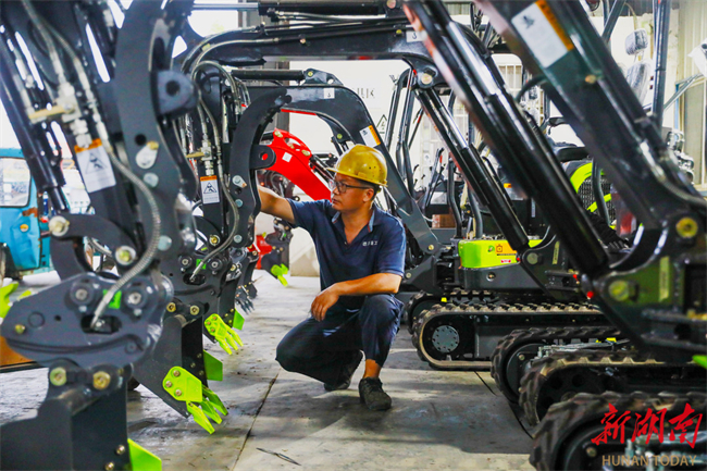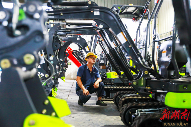 The photo, taken on October 13, shows workers producing mini excavators against the clock to fulfill overseas orders at a heavy industry company in Xintian County. In recent years, the company has intensified efforts in technological innovation and product research and development. Its mini excavators, including various models of garden excavators, electric excavators, and hybrid-power excavators, have gained popularity in the overseas markets such as Europe, America, and Southeast Asia. (Photo/Liu Guixiong)