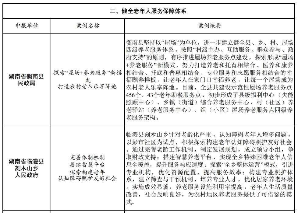 衡南县民政局申报的《探索“屋场+养老服务”新模式 打造农村老人乐享阵地》案例,以“屋场”为单位,进一步建立健全县、乡、村、屋场四级养老服务体系,按照“村级主办、互助服务、群众参与、政府支持”的原则,有序推进屋场养老服务点建设,探索形成“屋场+养老服务”新模式,努力打造养老和托育相结合、医养和康养相结合、托底和普惠相结合、专业服务和志愿服务相结合的幸福颐养样板,让老年人在家门口幸福养老,让每一个屋场成为农村老人乐享阵地。目前,全县共建设示范性屋场养老服务点456个、老年助餐服务点43个,初步形成了县级福利中心(失能照顾中心)、乡镇(街道)综合养老服务中心、村(社区)养老驿站(养老服务中心)、组(小区)屋场养老服务点四级养老服务架构。