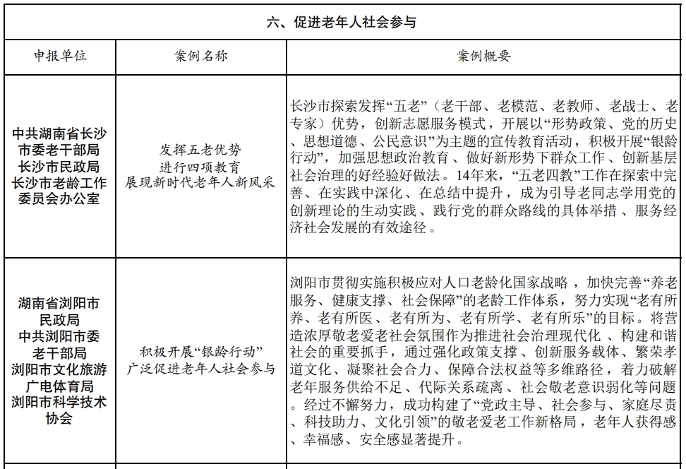 浏阳市民政局、浏阳市委老干部局、浏阳市文化旅游广电体育局、浏阳市科学技术协会申报的《积极开展“银龄行动” 广泛促进老年人社会参与》案例,通过加快完善“养老服务、健康支撑、社会保障”的老龄工作体系,努力实现“老有所养、老有所医、老有所为、老有所学、老有所乐”的目标。将营造浓厚敬老爱老社会氛围作为推进社会治理现代化、构建和谐社会的重要抓手,通过强化政策支撑、创新服务载体、繁荣孝道文化、凝聚社会合力、保障合法权益等多维路径,着力破解老年服务供给不足、代际关系疏离、社会敬老意识弱化等问题。经过不懈努力,成功构建了“党政主导、社会参与、家庭尽责、科技助力、文化引领”的敬老爱老工作新格局,老年人获得感、幸福感、安全感显著提升。