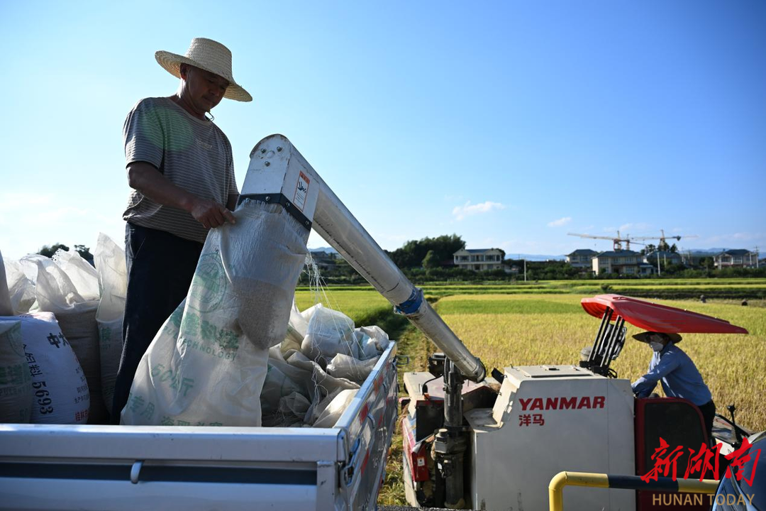 湖南日报·新湖南客户端10月15日讯(通讯员 杨敏佳)金秋十月,洪江市安江镇千亩杂交水稻示范基地迎来丰收。基地里,稻浪翻涌、稻香四溢,收割机轰鸣穿梭,农民们弯腰补收,收割后的稻谷随即装袋转运,“机器+人工”协同作业的繁忙场景,勾勒出千亩杂交水稻示范基地的丰收图景。