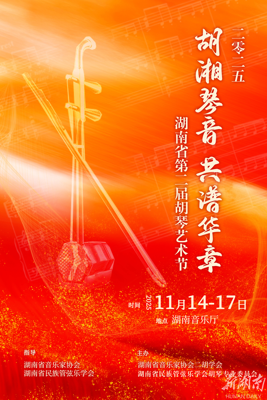 湖南日报·新湖南客户端10月15日讯(记者 胡雪怡)近日,湖南省音乐家协会二胡学会与湖南省民族管弦乐学会胡琴专业委员会联合发布通告,确定“胡湘琴音·共谱华章”湖南省第二届胡琴艺术节将于11月14日至17日在湖南音乐厅举行。