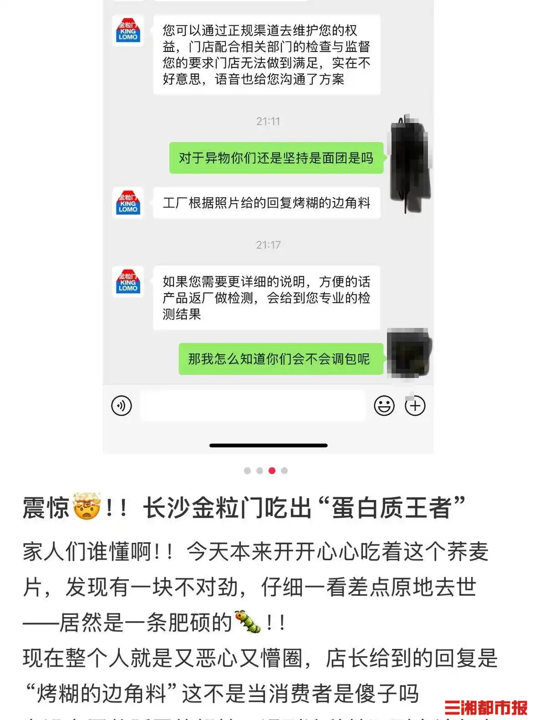 记者从“宝妈不烦”展示的图片中看到,一块荞麦片上确有一处形似大只蠕虫的物品,呈棕褐色。而从该名消费者公开的票据和沟通记录可见,发现问题后,她立即联系金粒门相关工作人员,对方给出的回应是“工厂根据照片判断是烤糊的边角料”,并提出若需进一步说明可将产品返厂检测,会出具专业结果。双方反复沟通,却始终没有达成一致,消费者“宝妈不烦”选择在社交平台发帖,希望能以此得到品牌方更正式的回应。