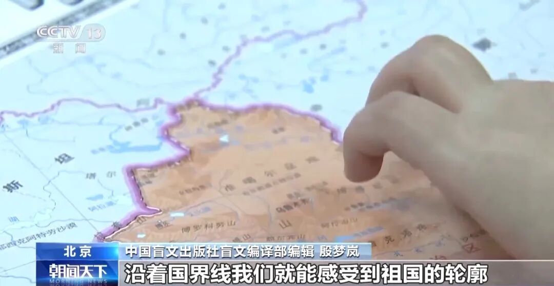 中国盲文出版社盲文编译部编辑 殷梦岚:让我感受到祖国幅员辽阔,从小就听人说祖国的地图,像一只雄鸡在东方报晓,我这次深深体会到了雄鸡的样子是什么样的。首先我们可以摸到比较粗的线条代表的是国界,沿着国界线我们就能感受到祖国的轮廓,感受到祖国的范围非常广阔,不是很连续的线条代表的是海岸线,我们在图上也可以摸到祖国的海岸线也是非常长的。