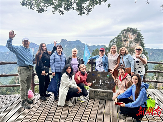 The photo, taken on October 14, shows Russian tourists posing for a group photo at the Huangshizhai Scenic Area in Zhangjiajie National Forest Park. Following the National Day and Mid-Autumn Festival holiday, the park's inbound tourism has maintained strong momentum, attracting numerous visitors from countries including Russia, Singapore, and South Korea. (Photo/Wu Yongbing and Yi Pengfei)