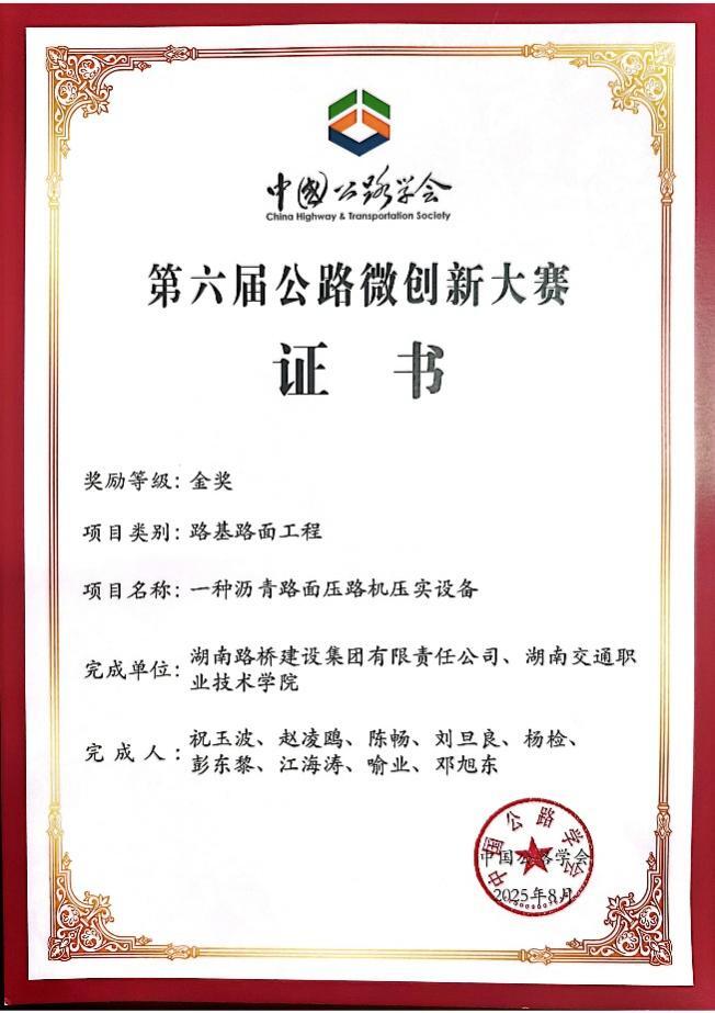此外,在中国公路学会“第六届公路微创新大赛”中,研究中心教师创新团队成员联合湖南路桥建设集团等企业申报的“一种沥青路面压路机压实设备”“一种中央分隔带护栏预制翻转装置”等5个创新项目分别斩获1金1银3铜,充分展现了学院教师创新团队在工程技术创新与应用能力方面的大幅提升。